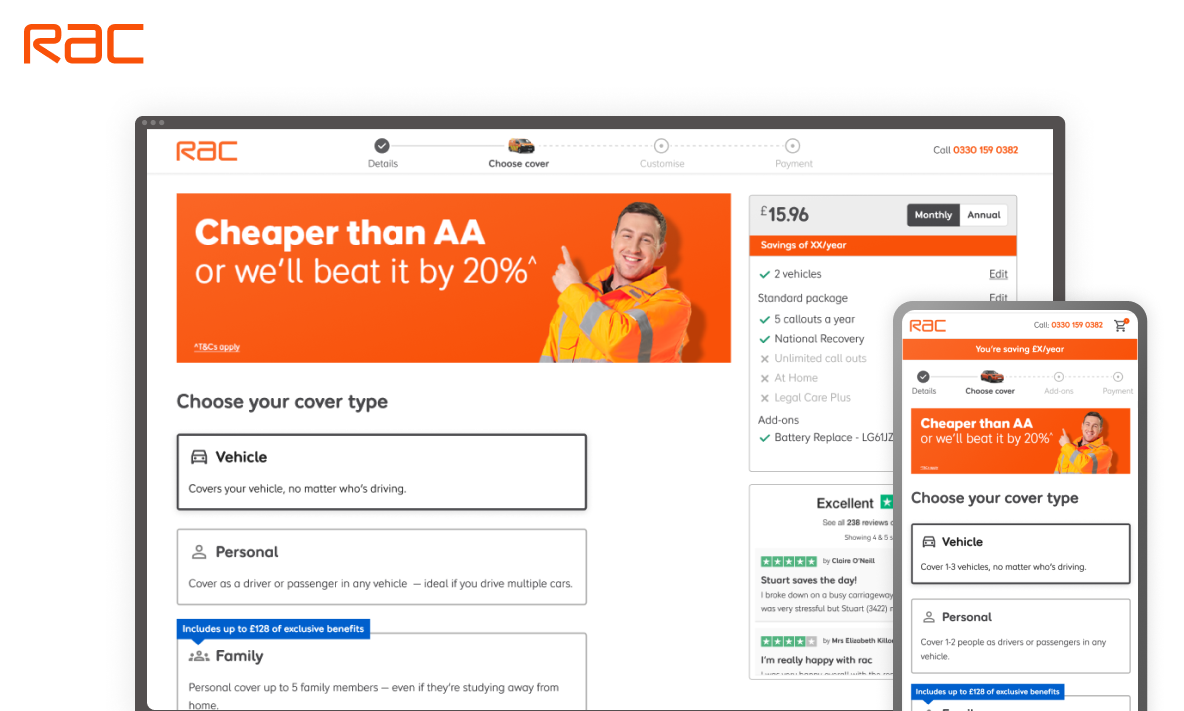 Leading UX for the RAC acquisition squad, I defined a scalable design system, collaborated with content, compliance and brand teams, and delivered hi-fi prototypes and UI specs across core journeys.